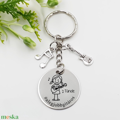 Gitárosnak ajándék - gitárosnő kulcstartó grafikával, egyedi névvel, felirattal