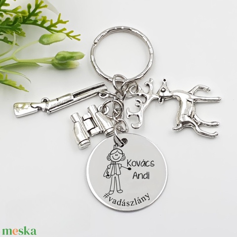 Vadásznak ajándék - vadásznő kulcstartó grafikával, egyedi névvel, felirattal