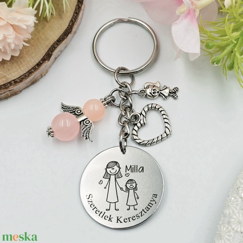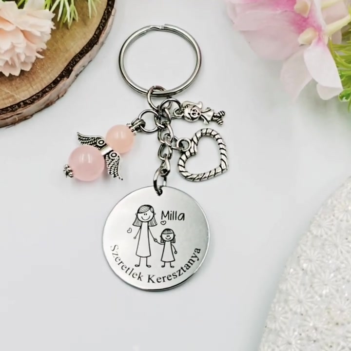 Keresztanyának ajándék - keresztanya kulcstartó grafikával, egyedi névvel, felirattal (kislányos)