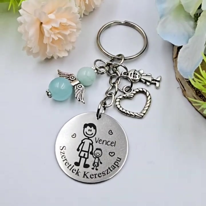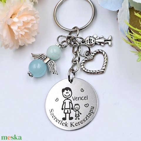 Keresztapának ajándék - keresztapa kulcstartó grafikával, egyedi névvel, felirattal (kisfiús)