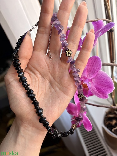 Ametiszt–Obszidián ásvány nyaklánc virág díszekkel – elegáns kézműves női ékszer