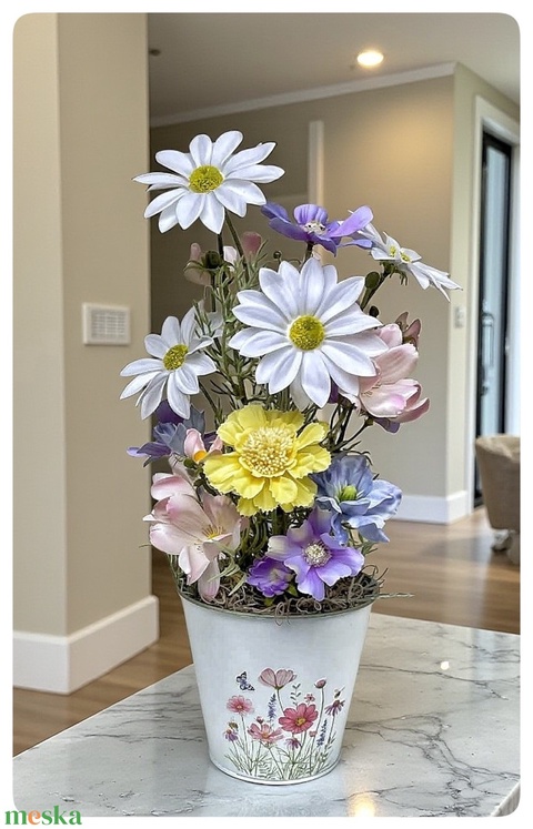 - Anyag/Összetevő bádog kaspó, művirágok
