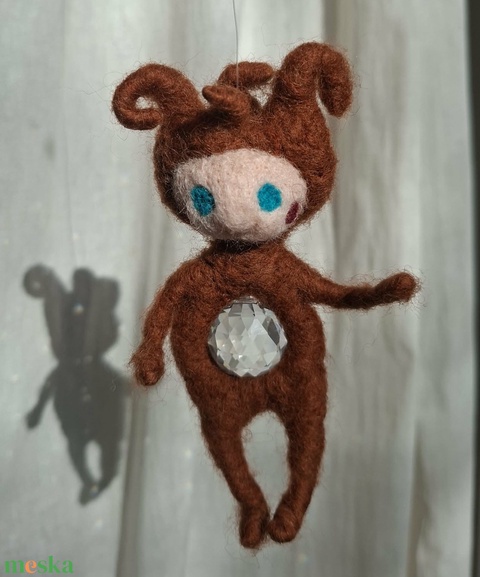 A manó tűnemez technikával, kézzel készült természetes gyapjúból. Testében egy napfénycsapda rejtőzik, amely szivárványszínűre töri a fényt, varázslatos hangulatot teremtve a térben.