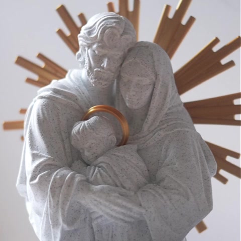 A kőhatású, aprólékosan kidolgozott szobor és a ragyogó arany glória ötvözete meghitt, letisztult eleganciát sugároz. A 22 cm magas műalkotás nemcsak gyönyörű dekoráció, hanem a hit, az oltalom és a harmonikus otthon mindennapi emlékeztetője is. Tökéletes és maradandó ajándék esküvőre, házszentelőre, vagy a családi fészek központi, lélekemelő ékeként.