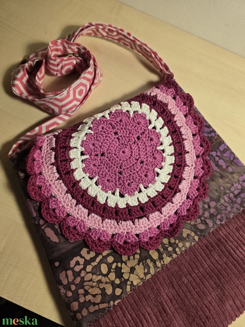 Női táska batikmintás textilből, horgolt fedőlappal és kordbársony talpacskával