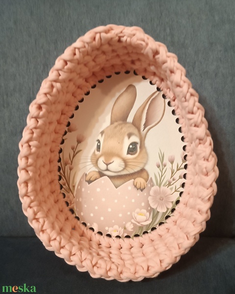 Nyuszi mintás , tojás alakú horgolt kosár Húsvétra
