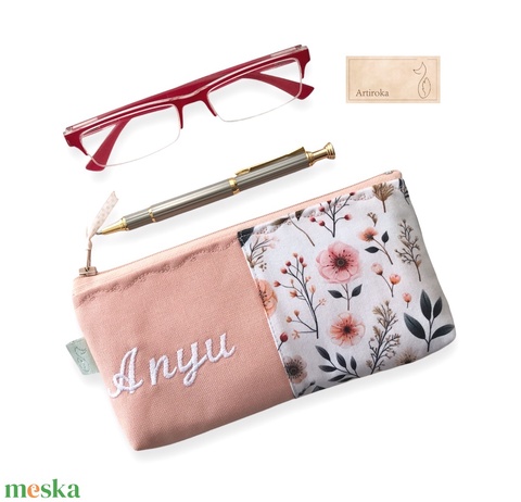 Barack színű, virágok mintás tolltartó neszesszer akár NÉVHÍMZÉSSEL - Artiroka design