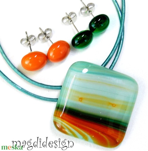 Türkiz barna beige csíkos üvegékszer szett nyaklánc 2 pár stiftes fülbevaló