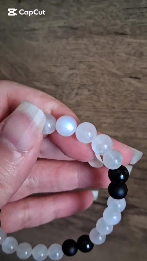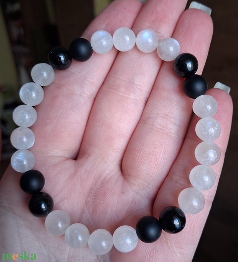 Szivárvány holdkő ásvány karkötő fekete turmalinnal és ónixszal