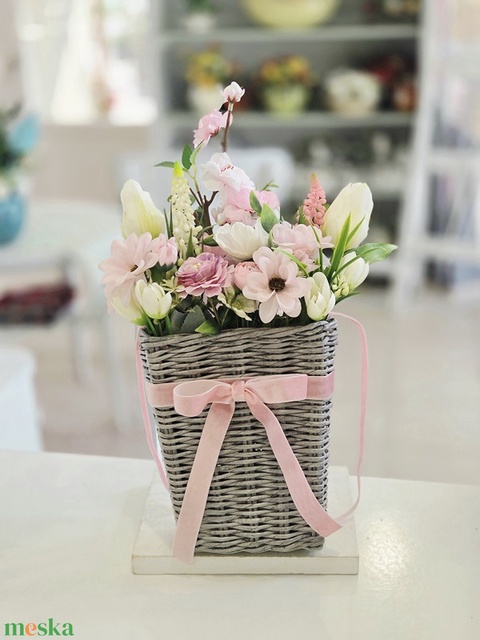 Szürke kosaras rózsaszín tavaszi ajtódísz