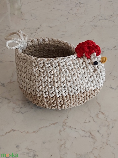 Kézzel horgolt tyúkocska kosár újrahasznosított pamut zsinórfonalból készítve, zab és homok színben. L méretű, szélessége 18 cm, magassága 14 cm. A tyúkocska szeme gyöngy felvarrásával készült, ezért 3 éves kor alatti gyermeknek nem ajánlott a termék. A műanyag tojások dekorációs célt szolgálnak, nem képezik a termék részét.