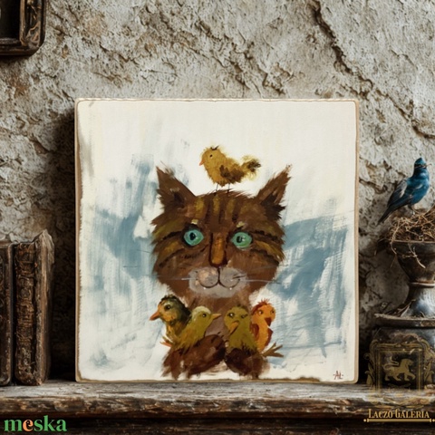 Kópé macska - Laczó Ágnes kortárs festő/grafikus művész- Eredeti Akril Festmény rusztikus fán, Madarak