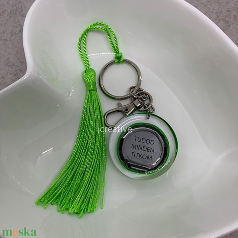 Epoxy kulcstartó felirattal – „Tudod minden titkom” - egyedi ajándék zöld bojttal, karabinerrel