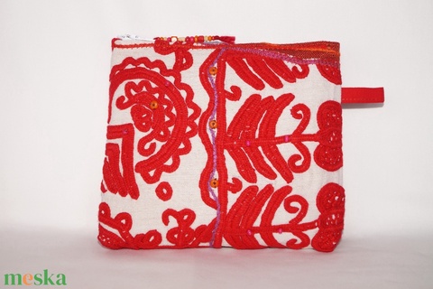 Piros, natúr, kézzel hímzett neszesszer, Kalotaszegi írásos kozmetikai táska, cipzáros neszesszer, tartóka