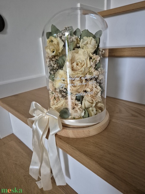 Ha nem szeretnél megválni életed nagy napján a kezedben tartott gyönyörűséges csokrodtól, legyen az élő vagy szárított, de akár selyemcsokor is, akkor add az én kezembe, és egy kb 27 cm magas búrába bújtatva visszaadom neked, hogy akár örökké emlékeztessen a csodanapotokra, ha ránézel :)