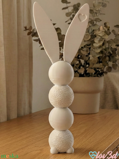 Imádnivaló 3D nyomtatott gömbös nyuszi texturált, kötött hatású felülettel és szív alakú fülekkel! Matt krém/fehér színben, tökéletes polcra vagy asztalra. Más színben is rendelhető – cuki ajándékötlet!