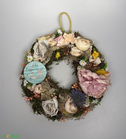 Villantós.3 - Pehelykönnyű ajtódísz napfényben megcsillanó rosegold elemekkel és "Édes Otthon" fatáblácskával