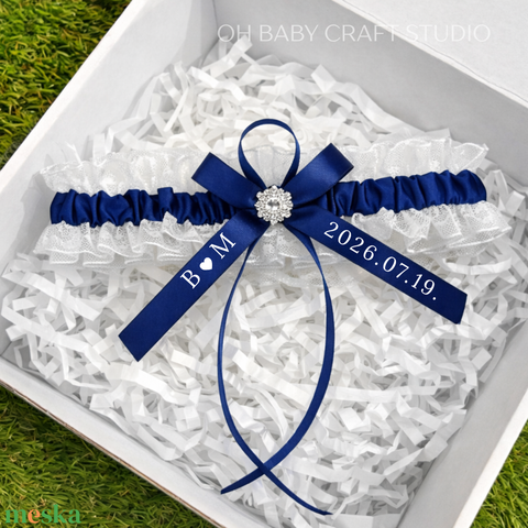 Menyasszonyi harisnyakötő – „valami kék” esküvői combcsipke egyedi felirattal