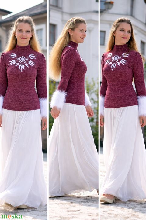 Kötött hatású, bordós színvilágú, melírozottnak ható, rugalmas viszkóz alapanyag. Széles és szépséges, ekrüfehér, hosszú szőrű, puha prémmel a mandzsettáján. Ráncolt, de nem túl magas nyak, kényelmes, nem szoros, kellemesen ölel. Elképesztően elegáns, akár alkalmi viseletnek is nagyszerű. Díszítése a napvirágból kisugárzó kalotaszegi tulipánforgó, újabb szerelmetes mintánk.