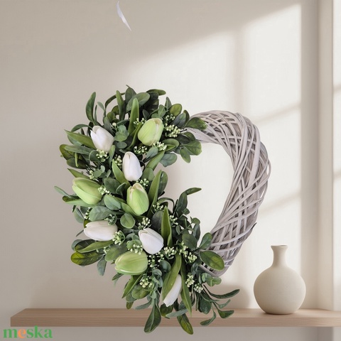 Romantikus ajtódísz/koszorú fehér és zöld tulipánnal – természetes hatású szív alakú koszorú