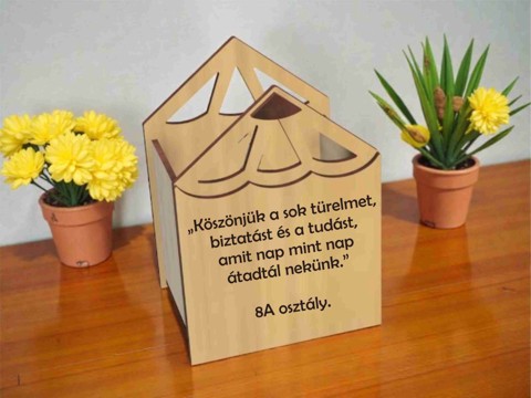 Pedagógus ajándék tanároknak – feliratozott fa tolltartó ballagásra A pedagógus ajándék tanároknak – feliratozott fa tolltartó egy különleges és maradandó emlék, amely tökéletes választás ballagási ajándéknak tanároknak vagy pedagógusoknak. Egy tanár életében a diákok visszajelzése és hálája az egyik legnagyobb érték, ezért egy személyes hangulatú pedagógus ajándék mindig nagy örömet okoz. A tolltartóra különleges feliratot helyeztünk el, mely méltó módon megünnepeli a tanárok elkötelezettségét és a közös időt, amit a diákokkal töltöttek. Méretei: 9x13x5 cm Pedagógus ajándék tanároknak – feliratozott fa tolltartó ballagásra A pedagógus ajándék tanároknak – feliratozott fa tolltartó egy különleges és maradandó emlék, amely tökéletes választás ballagási ajándéknak pedagógusoknak, tanároknak vagy tanítóknak. Egy tanár életében a diákok hálája és köszönete az egyik legszebb elismerés, ezért egy személyes pedagógus ajándék mindig nagy örömet jelent. Ez az elegáns fa tolltartó pedagógusoknak nemcsak praktikus, hanem egy emlékezetes köszönetajándék is. A gravírozott felirat segítségével a diákok kifejezhetik hálájukat azoknak a tanároknak, akik éveken keresztül segítették, támogatták és tanították őket. A ballagási ajándék tanároknak különleges pillanatokat idéz fel. A tolltartó minden nap használható az iskolában vagy az íróasztalon, így a pedagógus mindig emlékezni fog arra az osztályra, akiktől kapta ezt a kedves ajándékot. A természetes fa megjelenés elegáns és időtálló, ezért ez a tanár ajándék ballagásra nemcsak praktikus, hanem dekoratív is. Miért népszerű pedagógus ajándék? különleges köszönetajándék tanároknak praktikus és dekoratív természetes fa anyag tökéletes ballagási ajándék pedagógusoknak maradandó emlék az osztálytól Ajánlott alkalmak Ez a pedagógus ajándék tökéletes választás: ballagásra pedagógus napra évzáróra osztályfőnöknek ajándékba tanároknak köszönet ajándékként Termék jellemzők Termék típusa: pedagógus ajándék tolltartóAnyag: faFelirat: gravírozott pedagógus köszönet feliratAjánlott: tanároknak, tanítóknak, pedagógusoknak pedagógus ajándék tanároknak – ballagási ajándék tolltartó