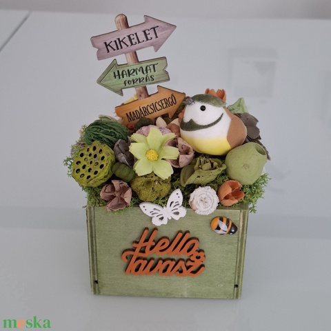 Fa ládikó madárral, útjelző táblával