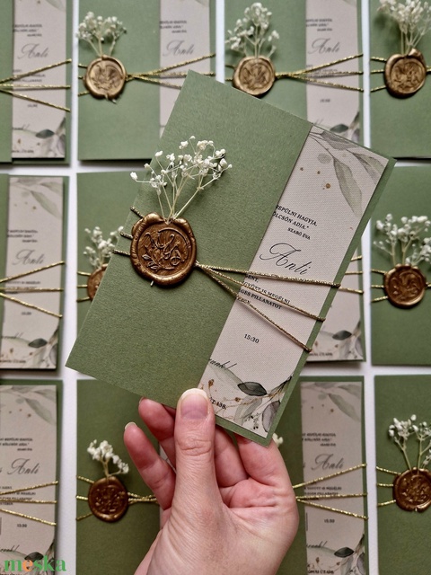 Esküvői meghívó, zöld borítóval, virággal