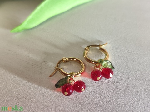 Egyedi aranyfényű nemesacél karika fülbevaló cseresznye medállal!
