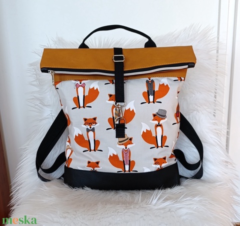 Műbőr rolltop hátizsák elején nyakkendős róka mintával