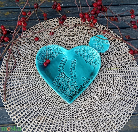 Szív virág és madárka mintás kerámia tál, türkiz