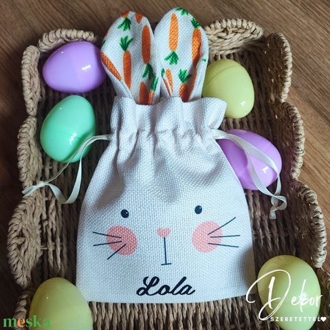 Húsvéti névreszóló zsákocska répás nyuszifüllel – kedves ajándékcsomagolás tojásokhoz és apró meglepetésekhez