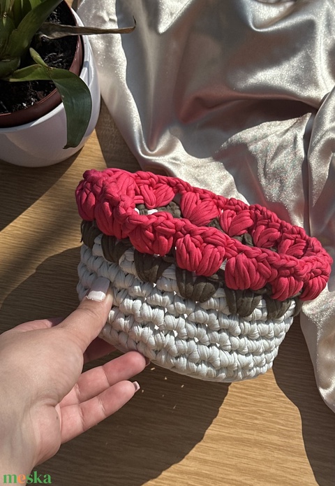 Kézzel horgolt tavaszi, tulipános tároló kosár. Dekoratív és praktikus kiegészítő a lakásban, amely húsvétkor tojástároló kosárként is tökéletesen használható.