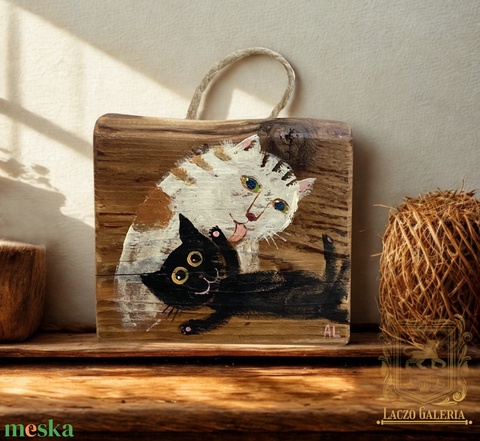 Reggeli mosdatás - Rusztikus Fatábla, Egyedi Falikép, Akril Festmény - Macska - Cica - Kormos