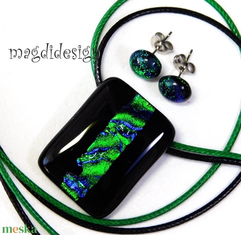 Fekete smaragd csíkos dichroic üvegékszer szett nyaklánc stiftes fülbevaló