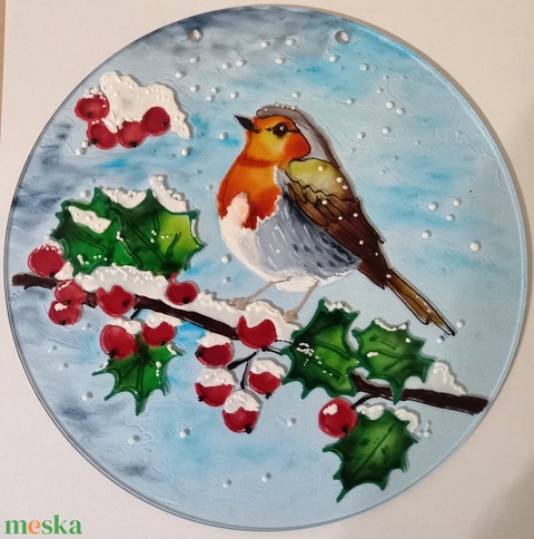 Vörösbegy havas ágon üvegfestmény