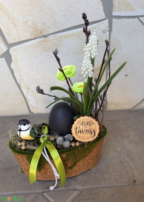Dinótojás - tartós tavaszváró asztaldísz a gigatojást örző picinke cinkéhez - a mohás kaspó kollekcióból (P-17)