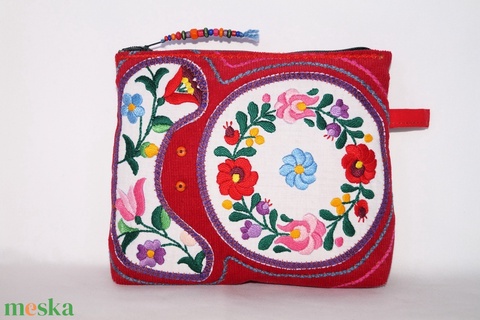 Kézzel hímzett neszesszer, színes kalocsai virágos kozmetikai táska, cipzáros neszesszer, tartóka