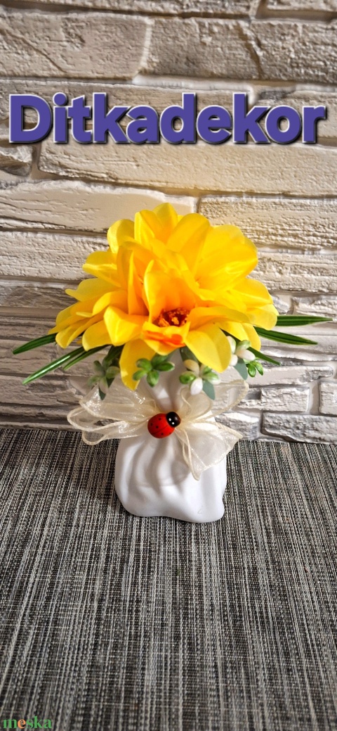 Napsárga Tavaszi Asztaldísz – Katicás Dekoráció Fehér Batyu Vázában (25 cm)