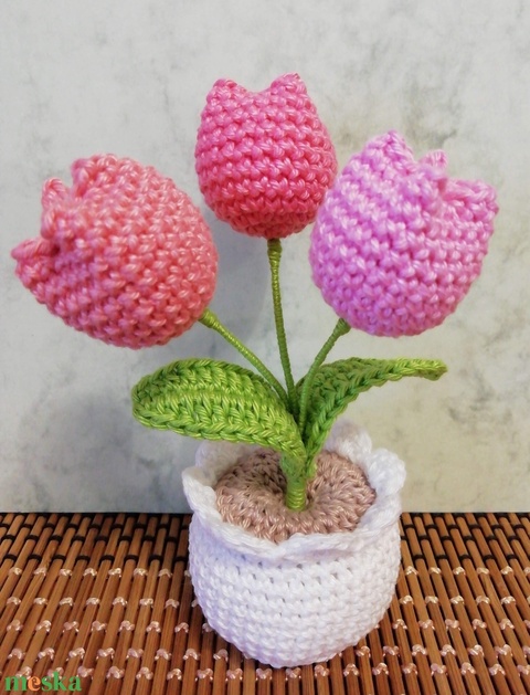 Horgolt tulipáncsokor kaspóban