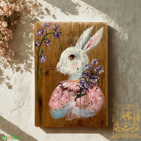 Virággyűjtő nyuszi - Rusztikus Fatábla, Gyerekszoba, Egyedi Falidísz, Húsvét, Virág, Nyúl, Nyuszi, Falikép