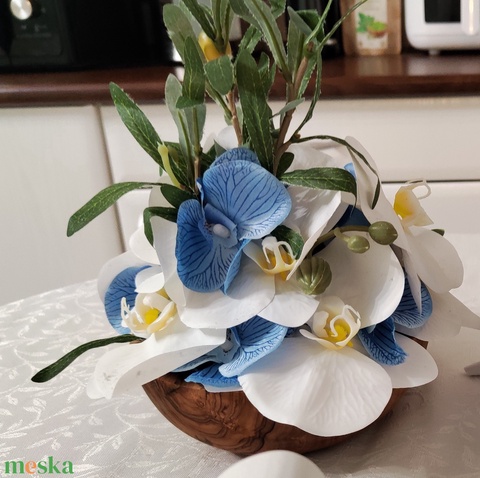 Fehér és kék orchidea asztal dísz olíva tálban.