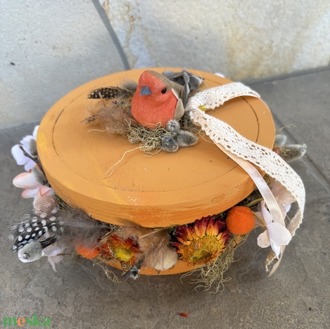 Sárgarépaszínű, madárkás, tartós tavaszi asztaldísz a virágszendvics kollekcióból (P-24)