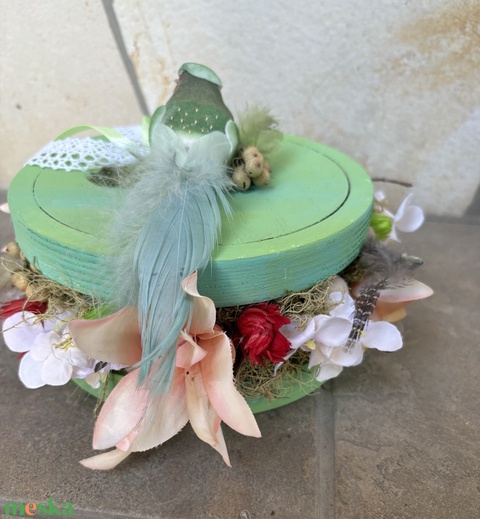 Zöldes-kékes, csodálatos hosszú farktollú madárkás, tartós tavaszi asztaldísz a virágszendvics kollekcióból (P-26)