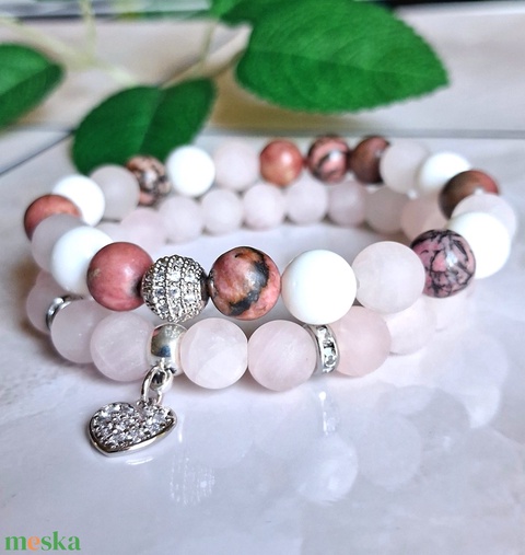 Rózsakvarc és rodonit ásvány karkötő szett – szívcsakra, szív medállal