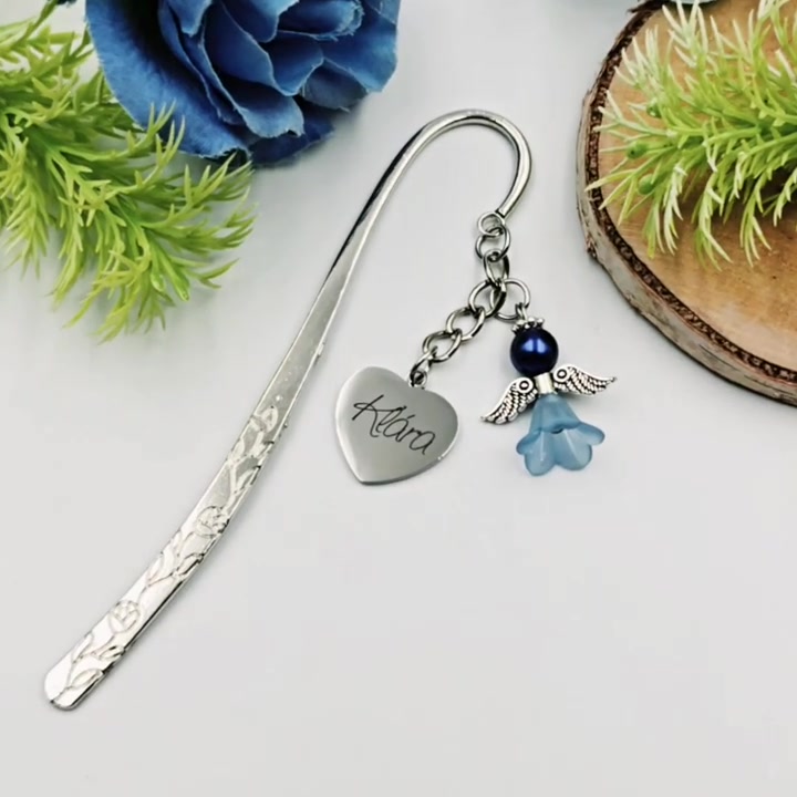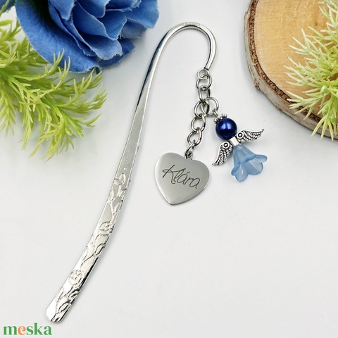 Gravírozott könyvjelző egyedi felirattal, kék angyalkával