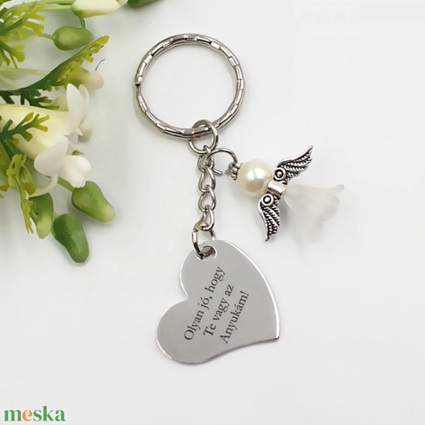 Szív alakú kulcstartó fehér angyalkával, egyedi felirattal - Ajándék anyák napjára