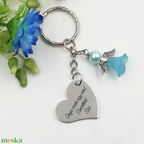 Szív alakú kulcstartó kék angyalkával, egyedi felirattal - Ajándék anyák napjára