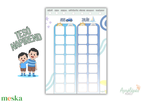 Tépőzáras napirend táblázat testvéreknek – személyre szabva, választható kártyákkal a hét napjainak jelölésével
