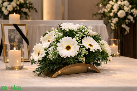 Fehér gerberás sírdísz – elegáns kegyeleti virágkompozíció