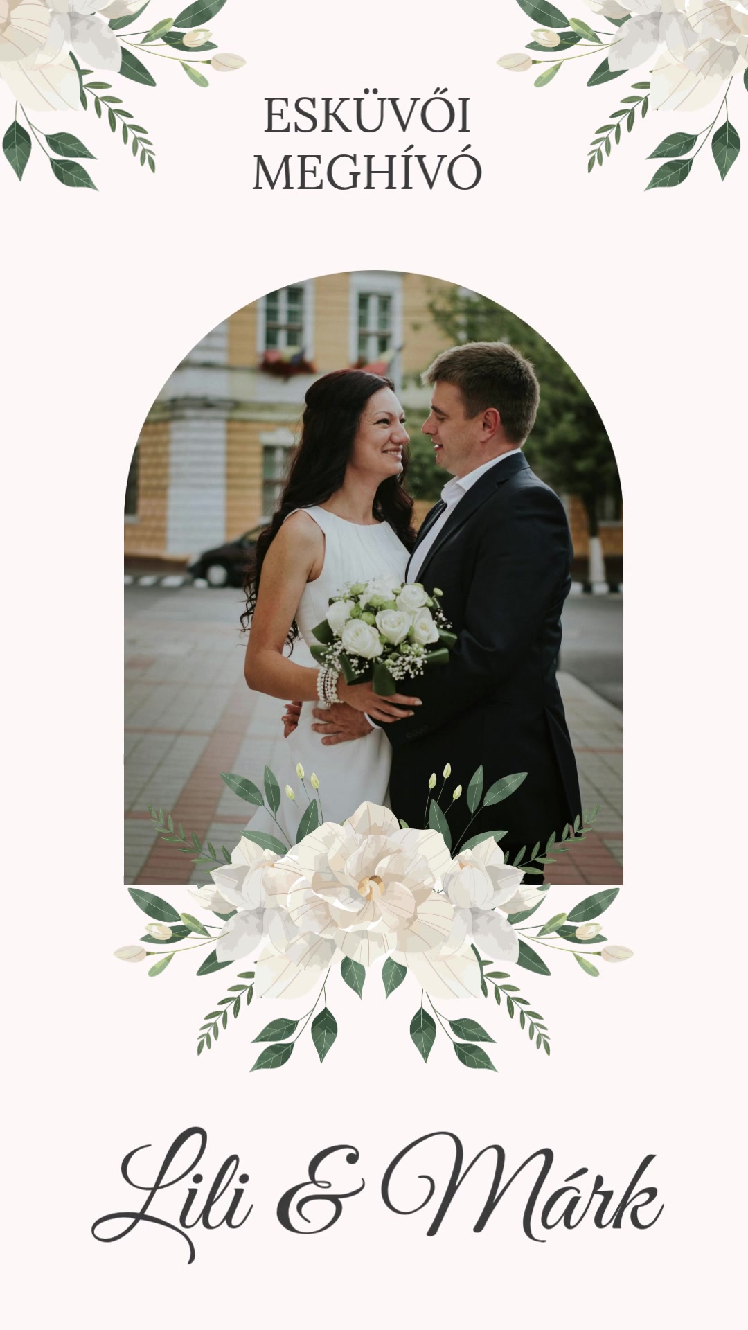 Digitális animált esküvői meghívó fehér virágokkal és saját fotóval